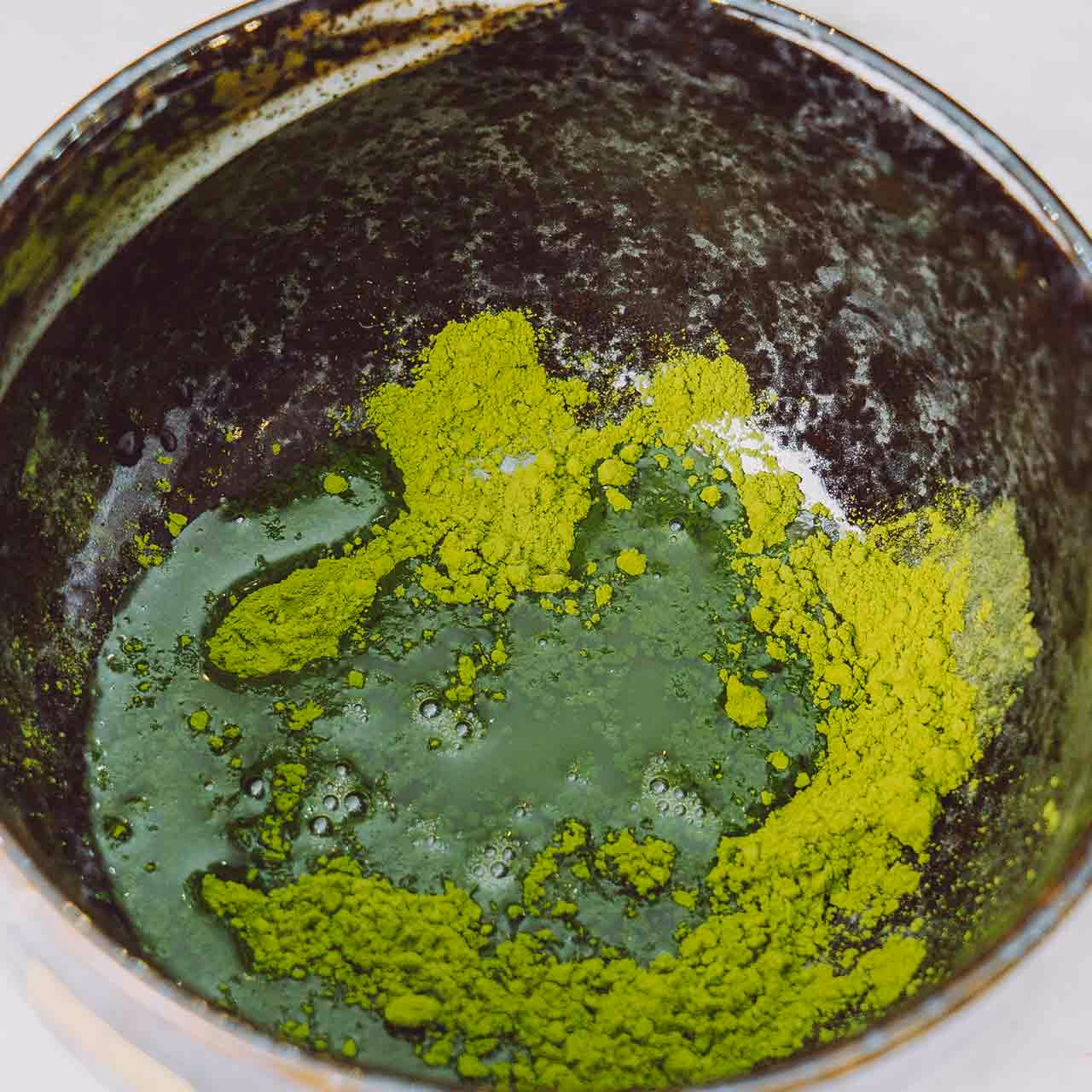 - Add the matcha powder to your cup/bowl, and then add 80C water.