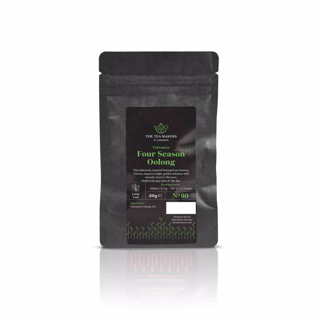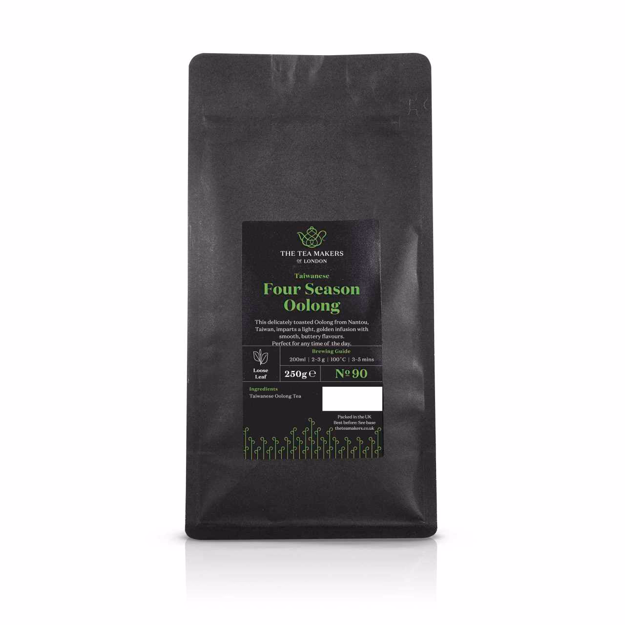 Our single-origin Four Season Oolong tea leaves begin life on a tea plant within a farm situated within the second smallest township in Taiwan; Mingtan. Falling within the only landlocked county of Taiwan, Nantou, the farm sits at an elevation of 350m above sea level and to produce this tea, tea leaves are plucked from the plant in Spring. Once complete, they will be withered, then left to cool, tossed, fixed by heat, rolled and dried. The result of this laboured process is a collection of tightly rolled leaf pellets that are dark green and brown. Once steeped, this oxidised Oolong imparts a beautiful light-yellow hue. On the nose, the aroma from the brew is floral, with notes of freshly roasted nuts. The mouthfeel is buttery, light and creamy with a floral bouquet and clean aftertaste.