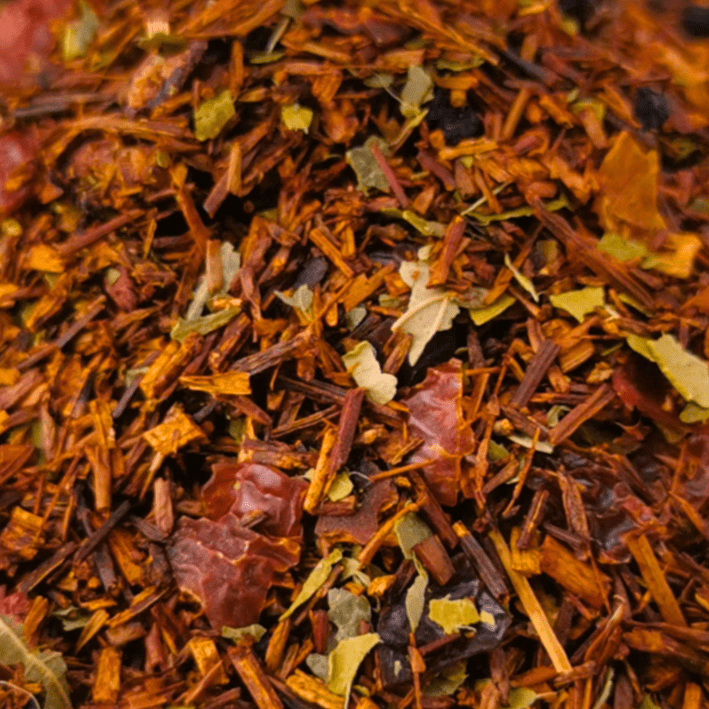 The result is a rich amber-to-ruby infusion that feels comforting and fruity at the same time — rounded rooibos depth, berry lift, and a delicate floral finish that lingers cleanly on the palate.