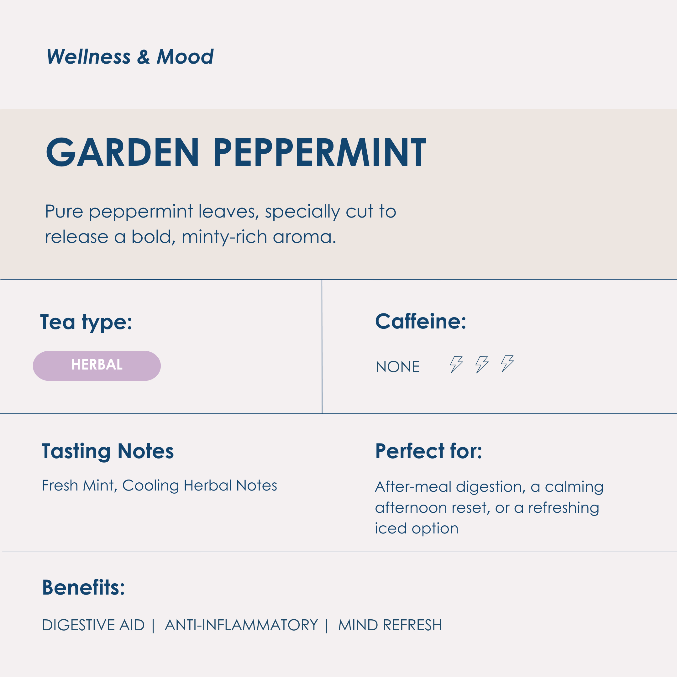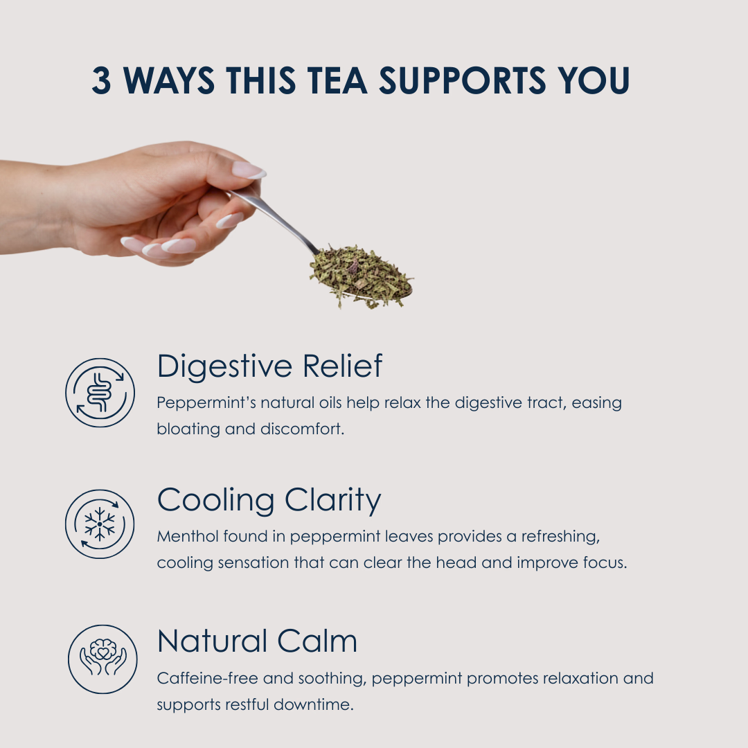 Experience the crisp, cooling lift of this special cut Peppermint Tea. Naturally vibrant and refreshing, it delivers a bold minty flavour with a clean, lingering finish. Peppermint is celebrated for its digestive benefits, helping to soothe bloating and support gut health.