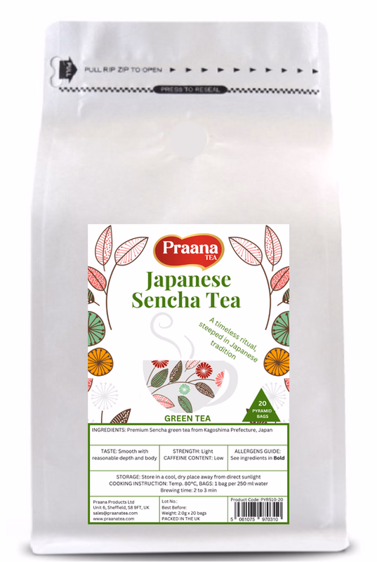 Experience the purity and elegance of Japanese Sencha Green Tea, now conveniently packed in eco-friendly biodegradable pyramid bags for a smooth, full-flavoured infusion.