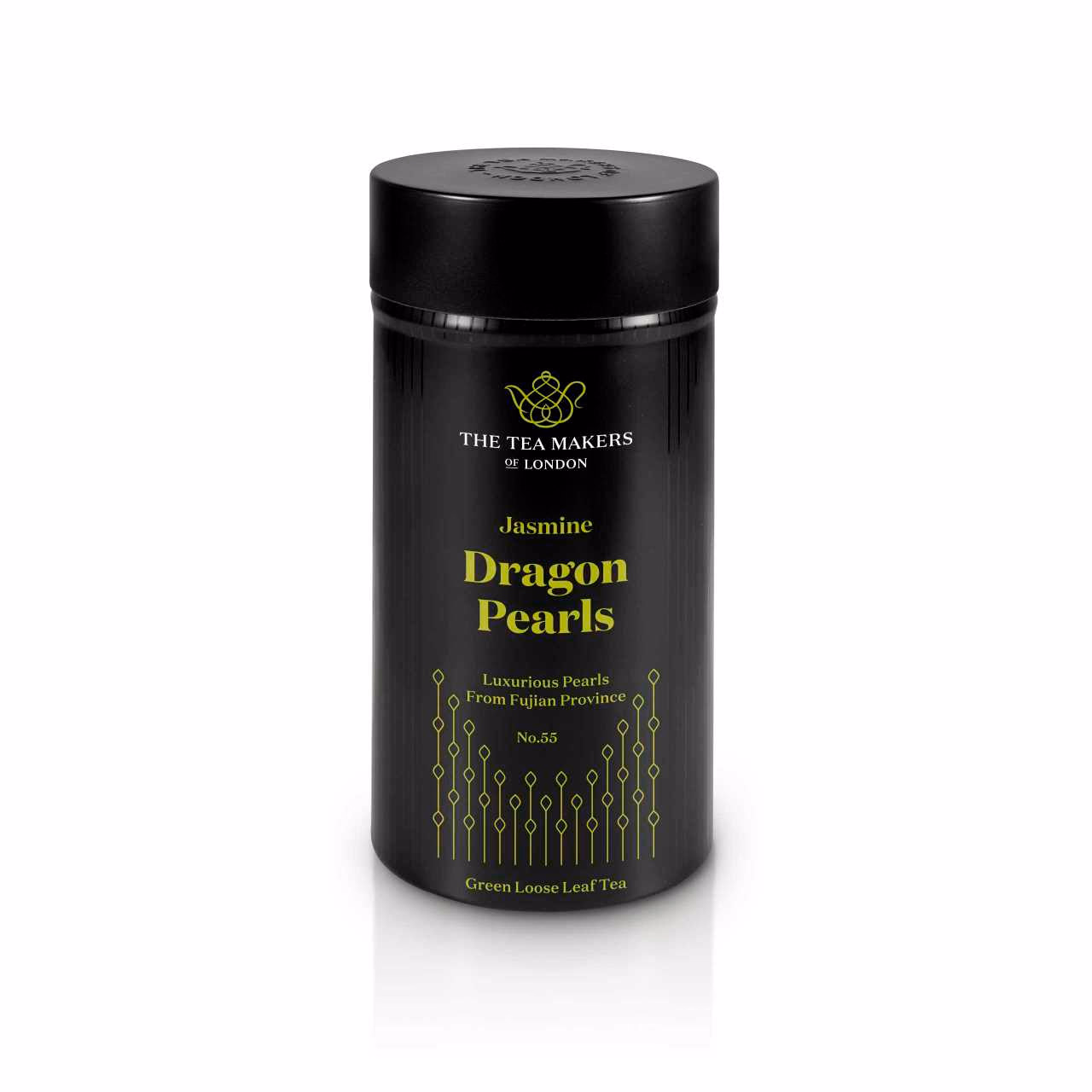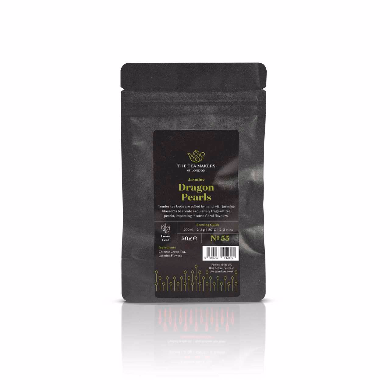 Known in China as 'mo li hua zhu', or Jasmine flower tea, Jasmine Dragon Pearls is an artisanal Chinese tea made from premium green tea leaves and jasmine flowers. During production, the tea leaves are layered with jasmine buds, which allows the essential jasmine oils to seep into the tea. The tea leaves are then delicately rolled into beautiful little pearls that unfurl when steeped in hot water.