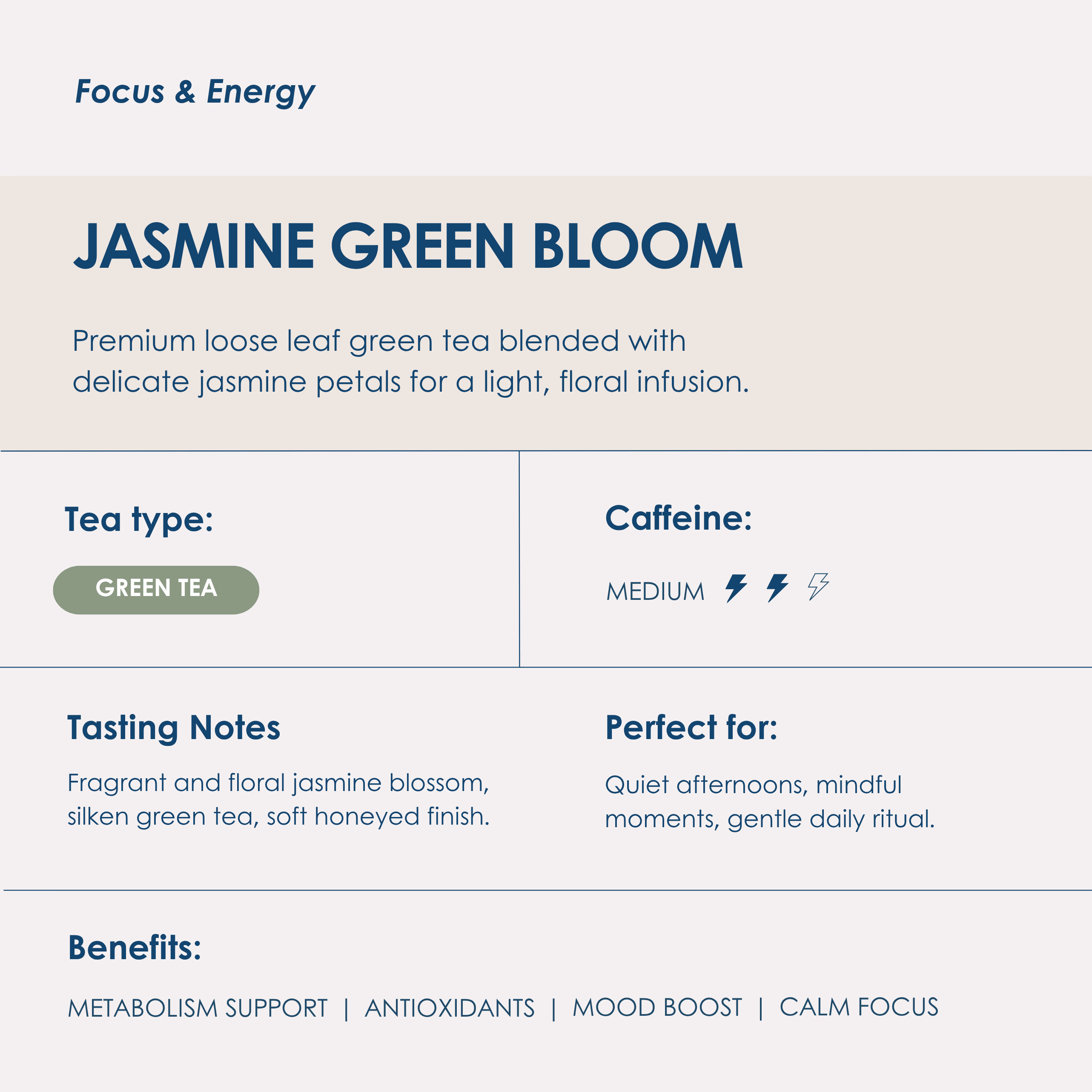 - Supports calm focus and gentle, sustained energy