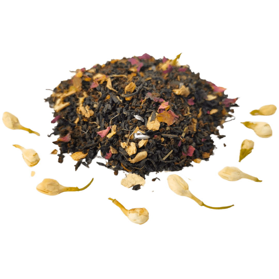 Black tea, ginger, cinnamon, cardamom, black & white pepper, clove, nutmeg, jasmine, rose & lavender petals