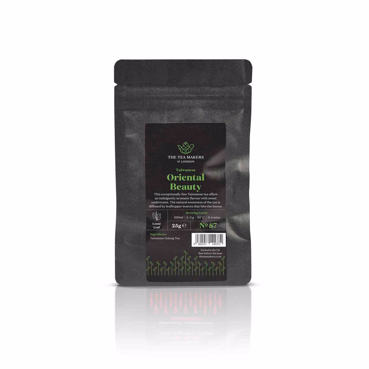 Also known as Dongfang Meiren, or Bai Hao ('white tip'), Oriental Beauty is grown in the Hsinchu County area of northern Taiwan. As its Bai Hao name suggests, it's one of the very few 'tippy' oolongs – only shoots containing one bud and two top leaves are selected for plucking. Our single-origin Oriental Beauty has been traditionally harvested in summer at the perfect point of oxidation, with the tea offering a refreshing light amber infusion and complex honey flavours with hints of dark cherry and cacao.