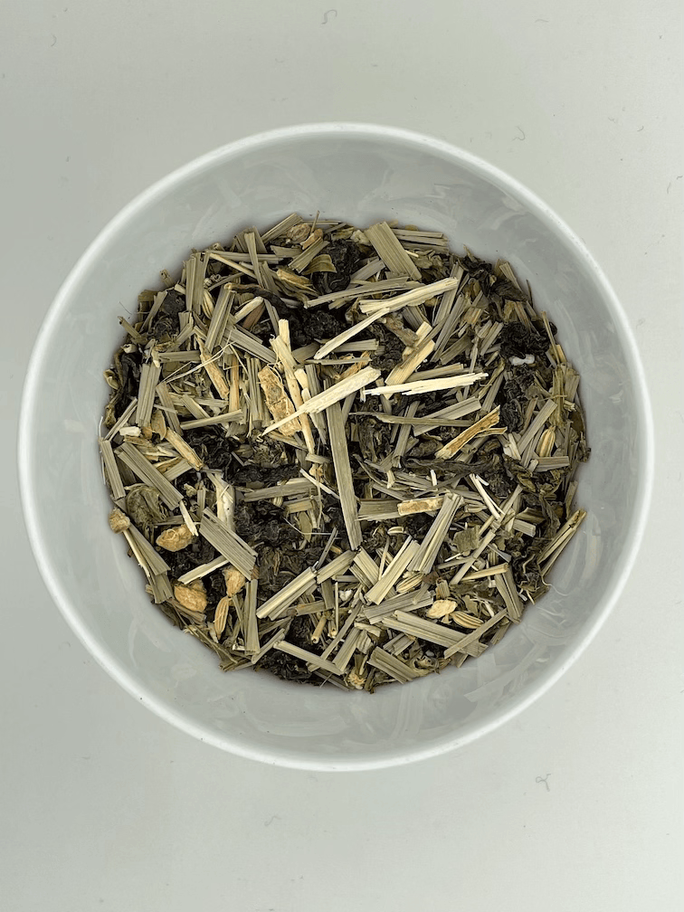 Ingredients: Oolong tea, Ginseng, Lemongrass, Ginger root, Yerba mate, Nettle leaf, Fennel seeds, Dandelion leaf
