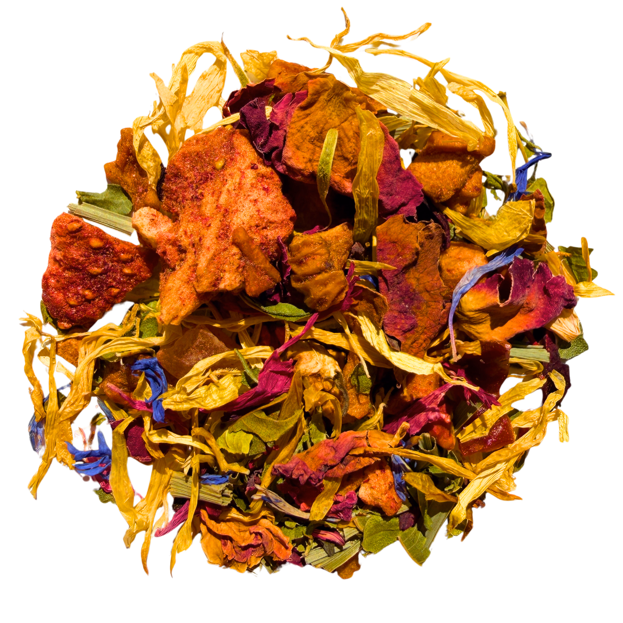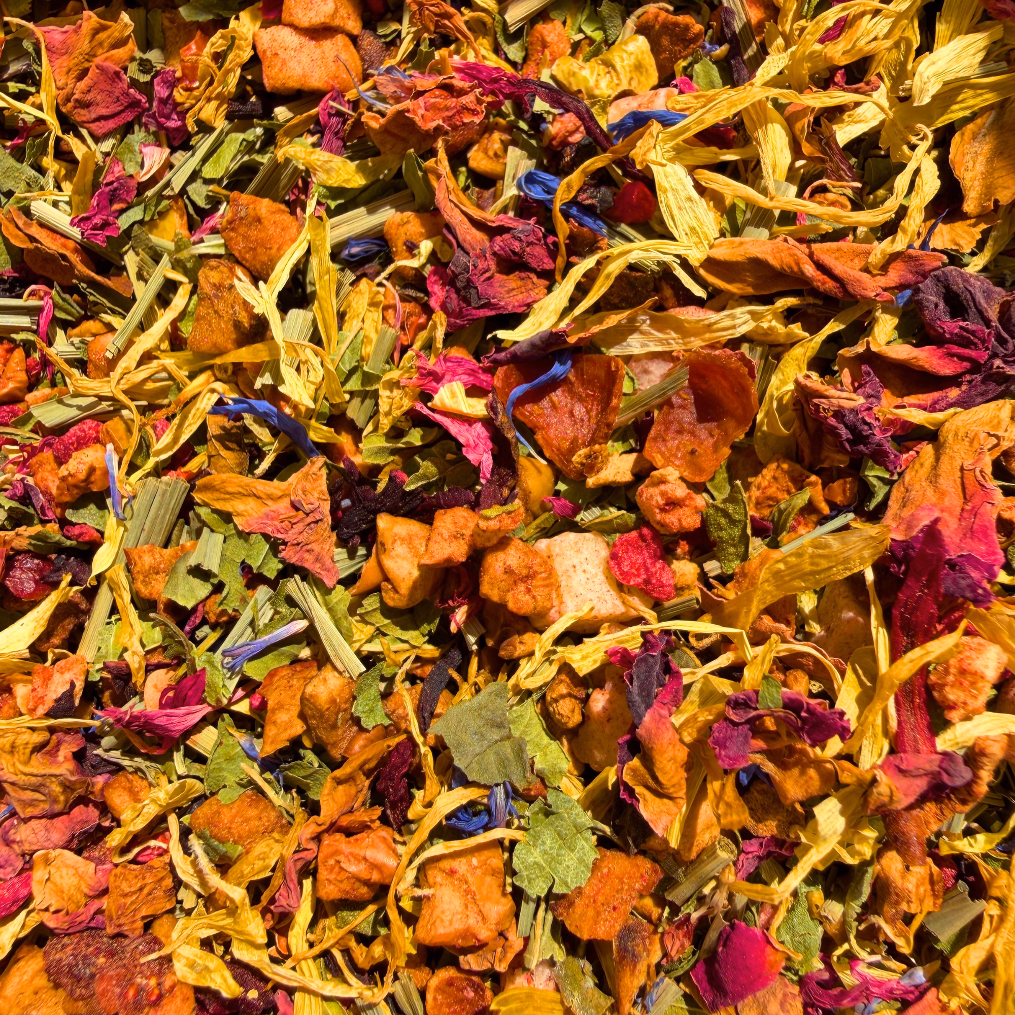 Lemon Verbena, Strawberry, Hibiscus, Rosehip, Papaya, Lemongrass, Lemon, Raspberry, Blackberry, Apple, Calendula, Cornflower petals.