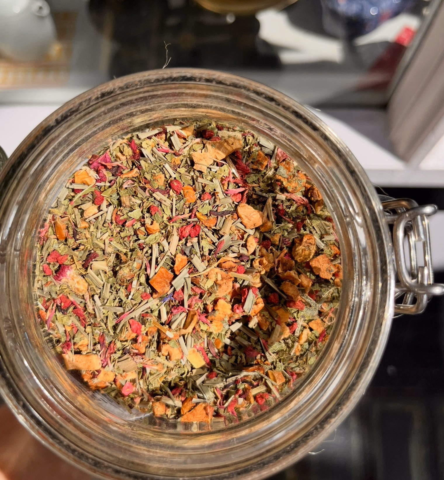 Apple pieces, Lemon Verbena, Lemongrass, Hibiscus, Lemon pieces, Raspberry pieces, Cornflower petals, Natural flavours.