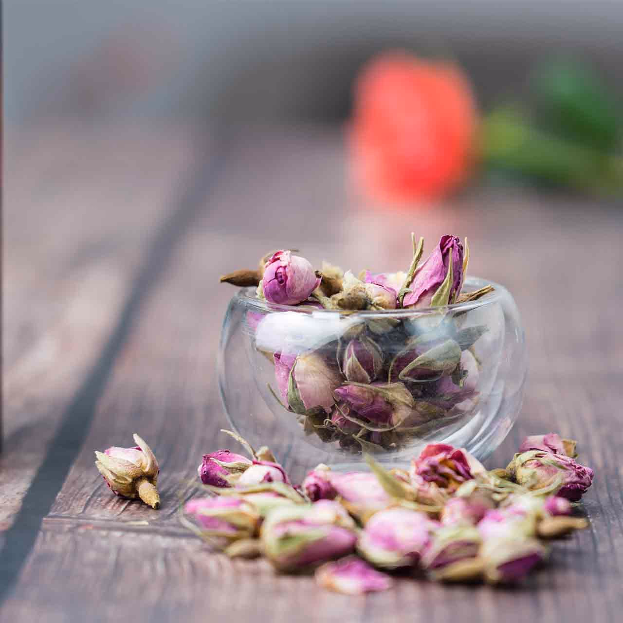 Used for thousands of years around the world for cosmetic, culinary, cultural and medicinal purposes, the side effects of rose is associated with several health benefits. The fresh rose petals in our Whole Rose Buds tea are rich in polyphenols, plant-based antioxidants linked to good cardiovascular health, preventing tumour growth and improved cognitive function – possibly even helping to ward off Alzheimer's. One of the antioxidants found in especially high quantities in rose tea is gallic acid, which has been shown to improve gut health and the microbiome while having powerful anti-inflammatory and antimicrobial properties. Rosebud tea is also said to be beneficial for weight loss. Rose petals also contain anthocyanins, associated with good eye health.